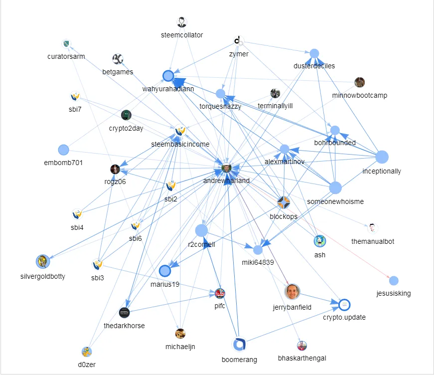 This is an interesting grouping. We can definitely see his commitment to @steembasicincome, with presence in multiple pools, along with a few highly connected users that aren't part of @steembasicincome. To me that always indicates potentially interesting accounts that I should check out and consider following from my personal account! We can also see a few red llines where he helps to deal with abusive users. Very interesting graph!