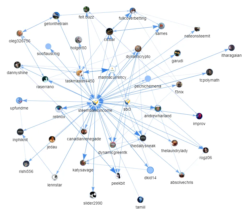 It only shows people that regularly upvote each other or @steembasicincome, but with multiple shares for bigger upvotes. That makes sense, because we have over 2700 active members across seven pools. All of those interrelationships would be too much for this chart.
