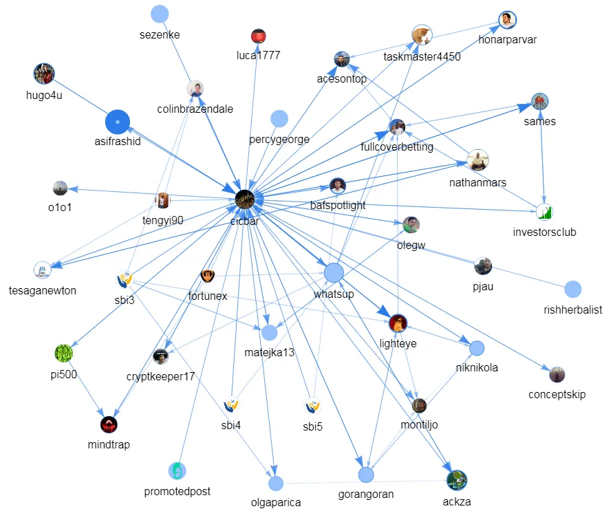 When you stare at enough of these clusters, they start to all look the same. The clustering structure is very similar to last time, but some of the names are different. @sbi3 showed up instead of @sbi4 this time, for example. We rotate which account is used to upvote and respond to comments in order to help manage the voting power across pools more effectively. This week it's been @sbi3 a little more frequently, although we are now using @sbi6.