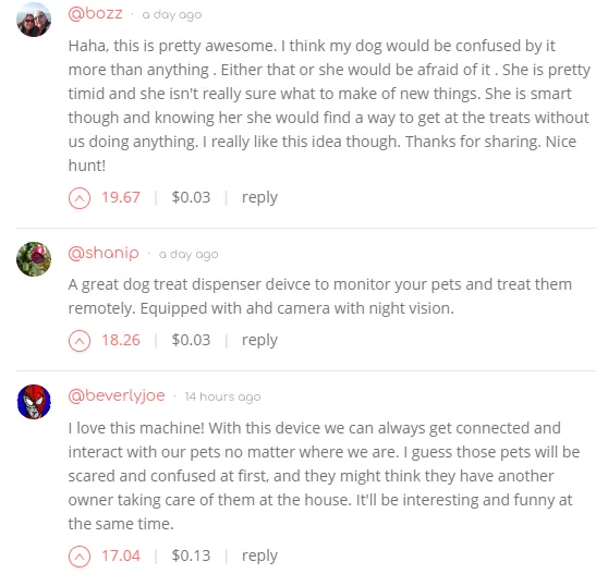 This is a view of users commenting and leaving upvotes (and being rewarded by these interactions):