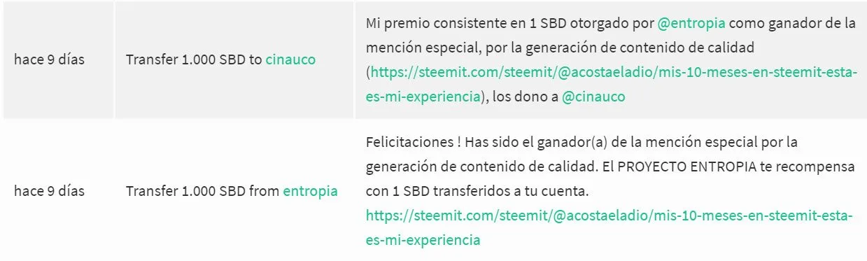 Nunca he participado en los concursos para darle espacio a los usuarios, sin embargo obtuve una Mención Especial en el primer post de los 10 meses, el proyecto @entropia me premio con 1 SBD, inmediatamente lo transferí al trail Cinauco.