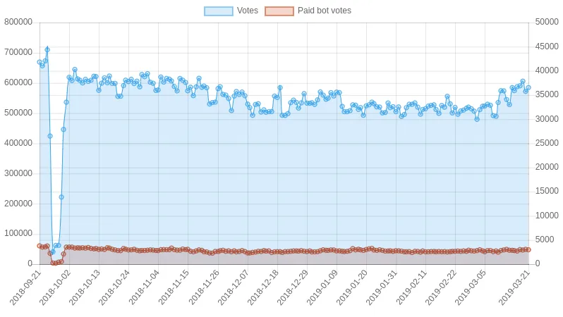 | Date | Votes | Paid bot votes | Percent bot votes |