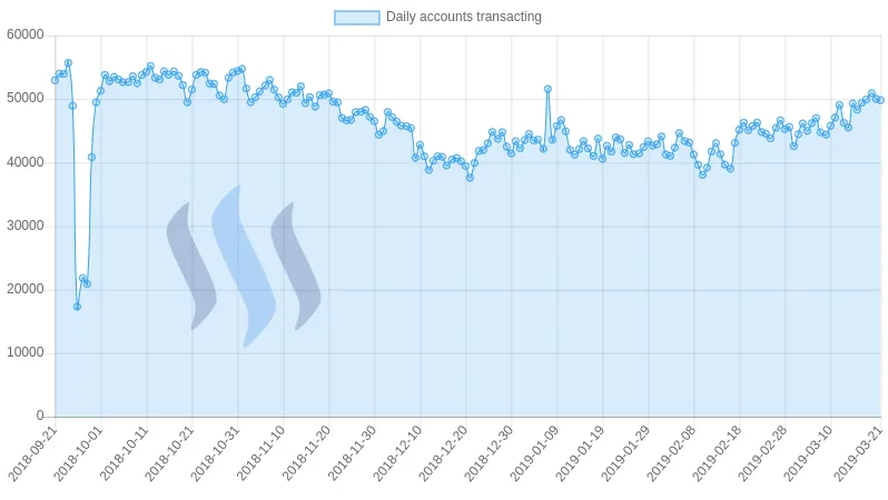 A 'transacting account' is a Steem account that made at least one transaction on the Steem blockchain. This can be a vote, post, comment, transfer, power up or sbd conversion. Users who only read from the Steem blockchain without interacting are not included. The actual number of 'Active users' is therefore much higher than the accounts transacting.