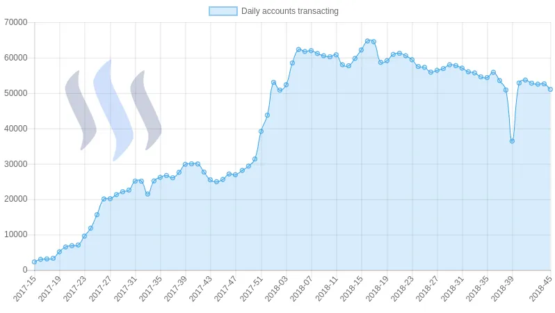 A 'transacting account' is a Steem account that made at least one transaction on the Steem blockchain. This can be a vote, post, comment, transfer, power up or sbd conversion. Users who only read from the Steem blockchain without interacting are not included. The actual number of 'Active users' is therefore much higher than the accounts transacting.