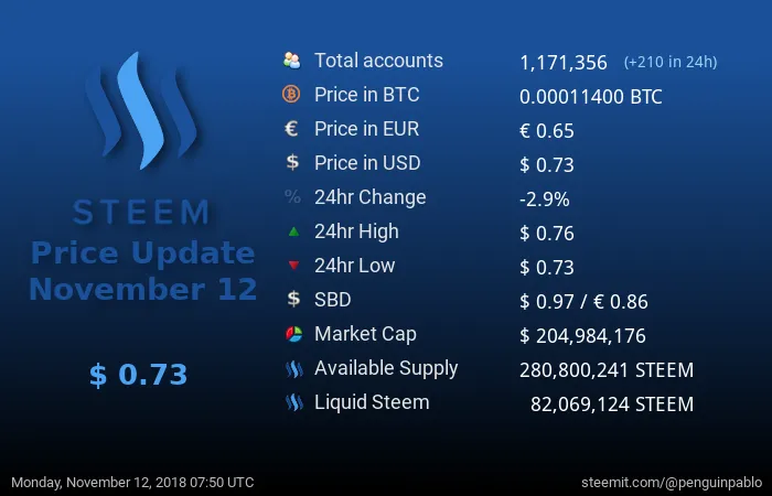 Welcome to my Steem Stats Report for Monday, November 12, 2018. All data comes directly from the Steem blockchain and is based on UTC time.