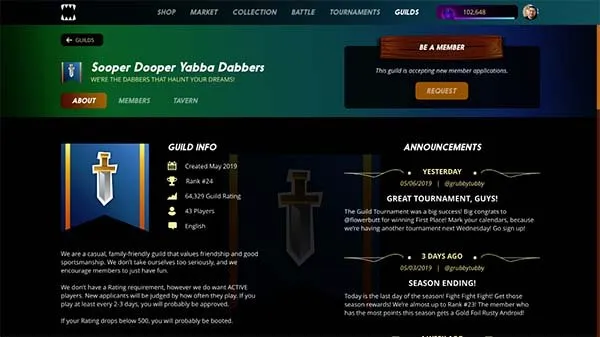 We then plan to build very significantly on top of that base to allow guilds to "level up" and earn bonuses and/or rewards for all of their members, to participate in guild wars which we envision to be a type of asynchronous tournament between two guilds, and much more!