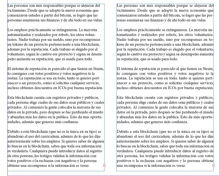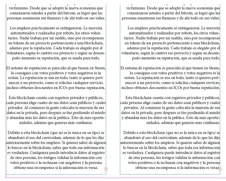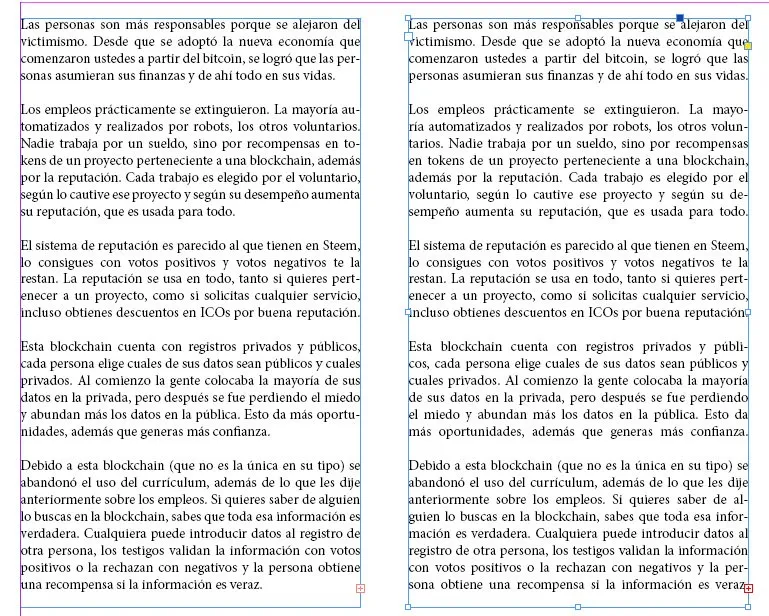 Esto hace que la izquierda sea más dinámica, aunque en este ejemplo no se vea muy bien y seguro tengamos que ajustar los guiones que separan las palabras para que las líneas lleguen al límite de la columna lo más posible. Vemos que la justificada posee un buen gris y no contiene Ríos considerables. También hay que ajustar los guiones ya que el programa separó sílabas de forma erronea.