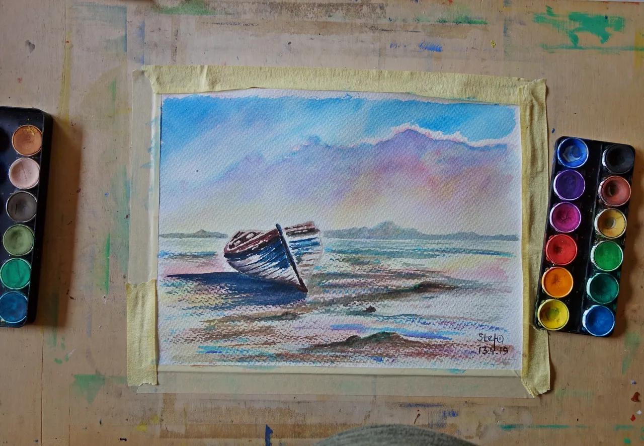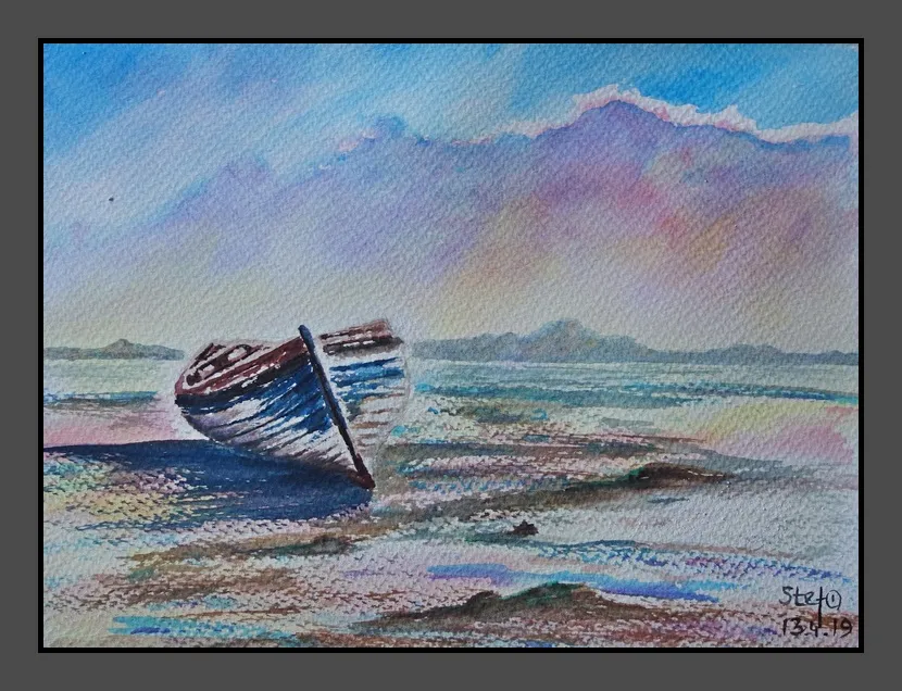 What I noticed first two colours laid very nicely but then I had to use blue, actually I have four different blues and decided to use the one that is between blue and green may be that was not right. Unfortunately my blue wash in lower part of sky flow down with water and turned my lemon yellow in something like a Lime colour: yellow and green. I think in future I will try to avoid it. I like the way how my boat came out.