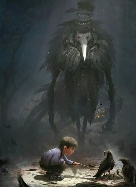 Lo primero que vislumbré fue una mano larga y nudosa sostenida en el borde de la puerta, que se movía haciendo sonidos retorcidos y perturbadores. Luego comenzó a asomarse poco a poco un cuerpo, cubierto por una vestimenta extensa de plumajes largos y negros, opacados por la suciedad de un aura impía. Y al final, se reveló su siniestro rostro de vástago de la muerte, igual al cráneo de un ave de rapiña. Su terrorífica apariencia era digna tanto de temer, como de analizar. Una criatura antropozoomórfica sobrenatural que recorre las paredes de mi hogar, ¿Qué es lo que buscaba tan temible e imponente ser? Era lo que me pregunté en ese momento y no me faltaban ganas de soltarle la pregunta, pero el terror se apoderó de mi lengua y me enmudeció por completo, y solo me quedé allí, observando.