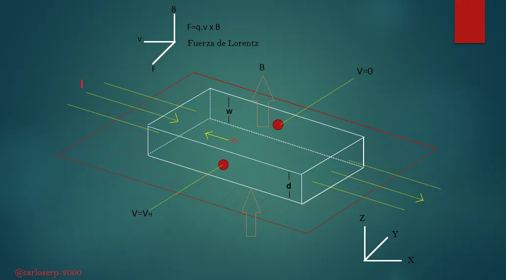 Este principio físico funciona para cualquier semiconductor, por ejemplo; si tenemos un material semiconductor con tipo de conductividad negativa, sabemos muy bien que por ser tipo n los portadores mayoritarios vendrían siendo los electrones que ocupan una mayor densidad en la muestra. Dicho ero se puede asumir que la corriente que circula dentro de la barra del semiconductor, fluye constantemente en el eje de coordenadas X de izquierda a derecha de un campo magnético Z como se muestra en la figura 1.