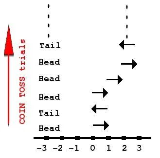 In a 1 dimensional case (consider a line), a fair coin toss experiment repeated multiple times can be considered as a 1D-Random Walk process. What does this mean? Fair coin toss gives you tails/heads with equal probability. See the figure below. Let us imagine an entity at origin point 0. We will associate the heads