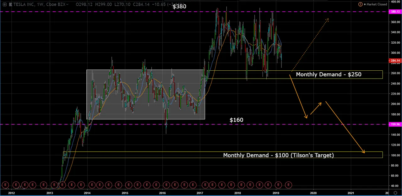 Recently, a former hedge fund manager, Whitney Tilson said Tesla will be below $100 by the end of 2019.