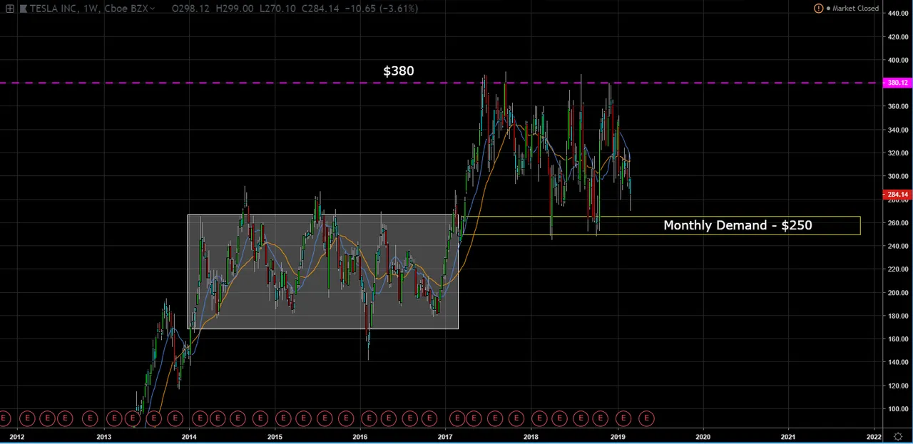 The top side level to pay attention to is the $380 level, but a breach of the monthly demand at $250 will take price down to the next box.