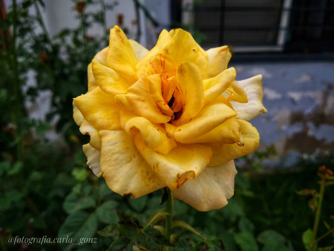 En la fachada de una casa había una planta con una solitaria rosa amarilla con destellos naranjas me pareció una forma sutil de belleza y delicadeza.