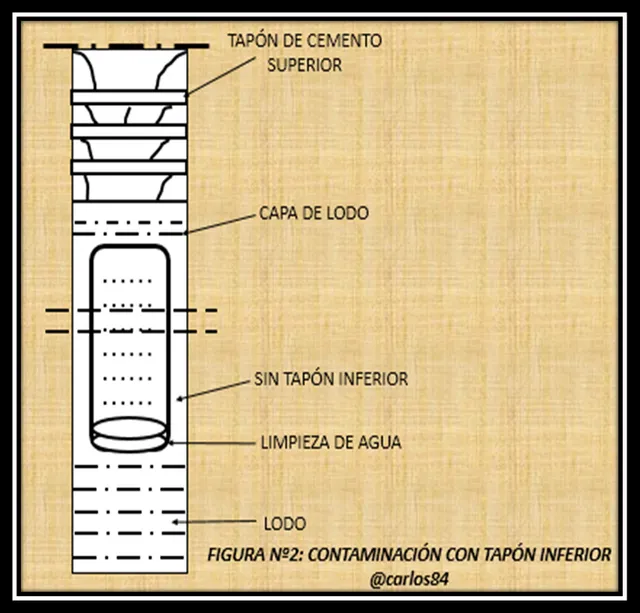 Cuando no se usa el tapón inferior, el cemento no limpia todo el lodo de las paredes del revestidor, esto origina que exista una zona contaminada que se forma en frente del tapón superior, a continuación se muestra en la figura Nº2 cómo se origina este evento.