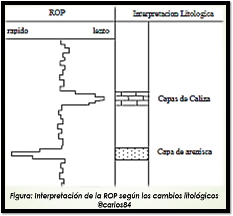 Es importante que la tasa de penetración (ROP) sea controlada, ya que un cambio brusco de la ROP que no incluyan ninguno de los factores nombrados, pueden llegar a significar un indicio de invasión de influjos no deseados hacia el pozo, es por ello que a continuación presento la siguiente figura que nos da un indicativo de cómo aumenta o disminuye la velocidad de perforación a consecuencia de los cambios litológicos.