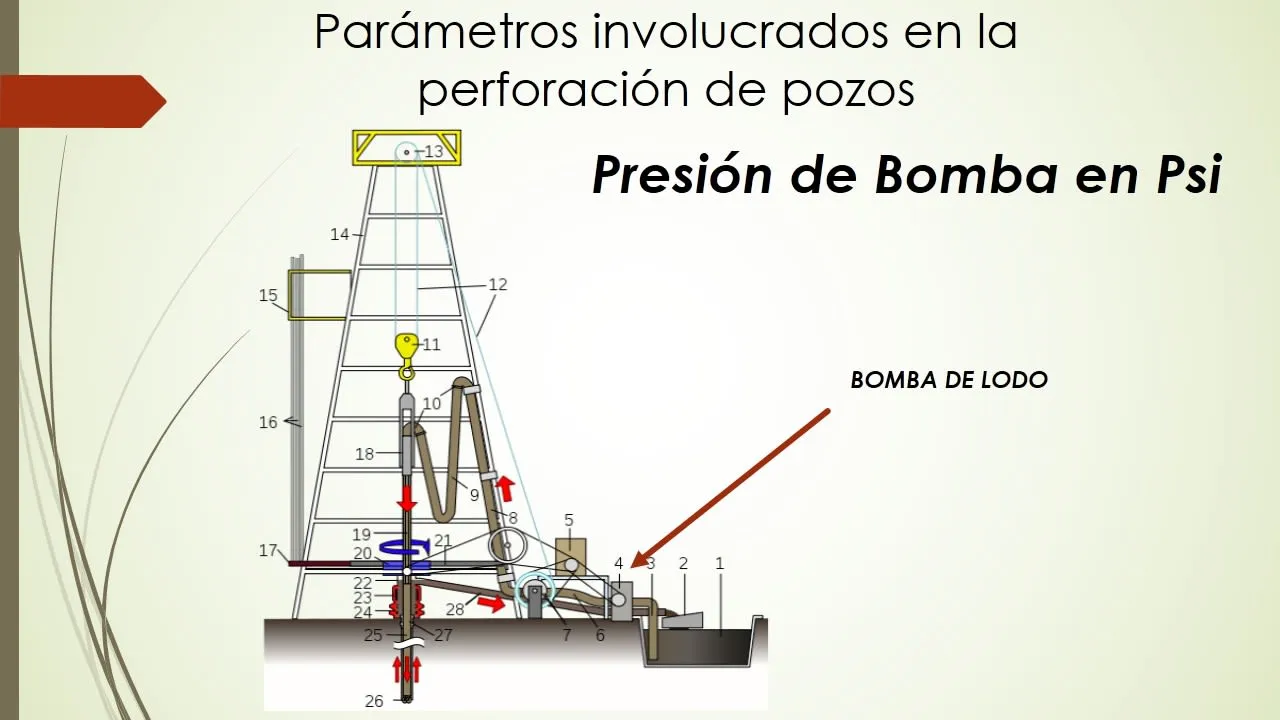 Son muchos los parámetros que dependen de que la presión de la bomba de lodo varíe, la mayoría de estos parámetros que influyen en la presión de bomba son propiedades del fluido de perforación, en este caso puedo mencionar algunos como: densidad, viscosidad, velocidad, sin embargo otros factores como: profundidad del pozo, geometría del hoyo, tamaño de las boquillas de la mecha de perforación y eficiencia de la bomba pueden alterar el valor de la presión de la bomba.