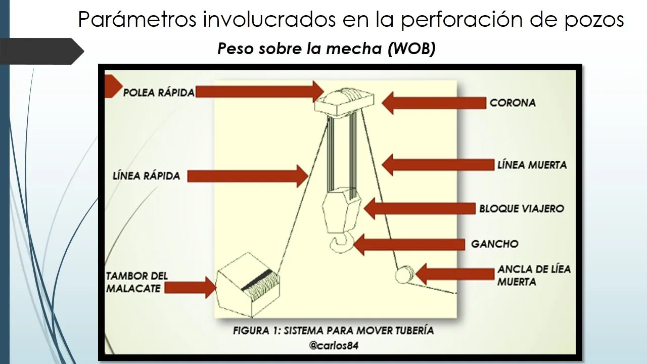 Peso sobre la mecha (WOB) = Peso de la sarta de perforación – Carga del gancho.