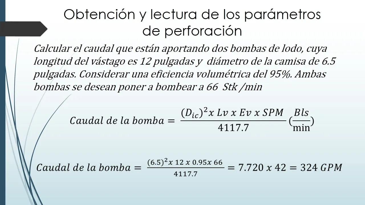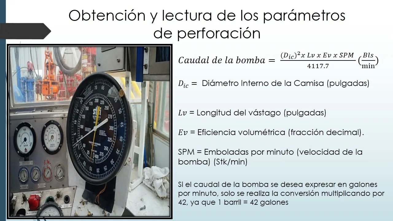 Muchos de estos parámetros de perforación se obtienen de manera directa bajo una lectura simple en el panel de control del perforador, mientras otros parámetros dependen de la lectura que se haya realizado de otros ya obtenidos. En el conversatorio dictado quise tomar un ejemplo del cálculo de la tasa de flujo del lodo de perforación medido en galones / minuto (GPM), ese es un caso de la obtención de un parámetro de perforación como es el galonaje de la bomba de lodo, que en su cálculo depende de la velocidad de bomba, diámetro de la camisa, longitud del vástago.
