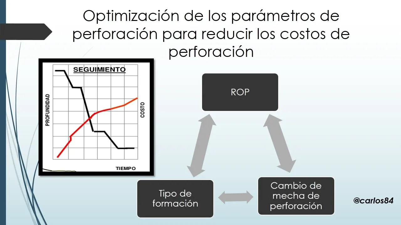 Optimizar los parámetros de perforación, significa que parámetros por ejemplo como la ROP, RPM, presión de bomba, galonaje, torsión, peso sobre la mecha trabajen en unidades acordes para que la perforación y construcción de un pozo de petróleo se ejecute en el menor tiempo posible y que genere los más bajos costos económicos.
