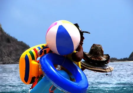 El infaltable vendedor de productos playeros, recorre las playas ofreciendo diversidad de mercancía: el de la foto está dedicado al ramo de los salvavidas infantiles y la venta de sombreros, pero puedes encontrar el vendedor de: lentes de sol, bisutería hecha con conchas marinas, semillas, mecatillo; el clásico kit de juguete playero para niños: el tobito y la pala.