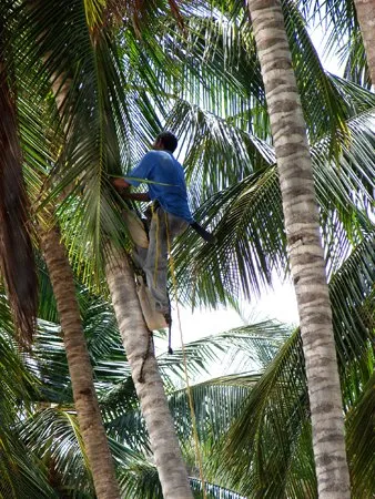 El señor que tumba los cocos. Con gran habilidad y destreza este trabajador trepa los cocotales y baja su carga para deleitarnos con un agua fresca, dulce, que sola o combinada con un buen licor es exquisita.