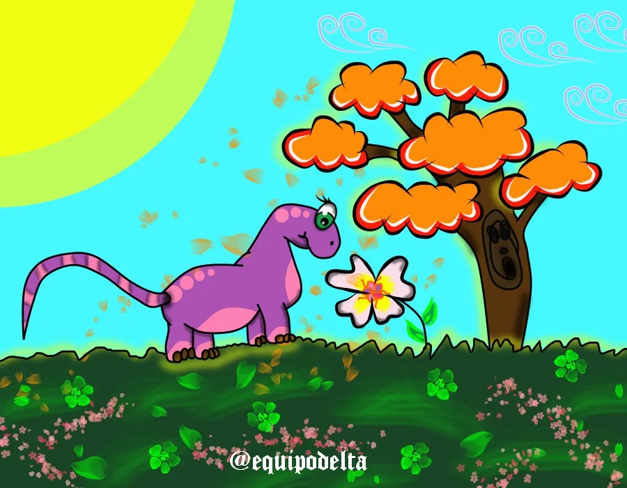 Como puedes ver, el diseño que te presento, está dibujado con cierta inclinación, para darte la idea que hay corriente de aire en la escena, la flor inclinada y el árbol inclinado que suelta sus hojitas bañando al pequeño dinosaurio y caen en el suelo, un sol radiante típico en mis diseños llenos de luz y dibujé unas formas para asemejar la brisa.