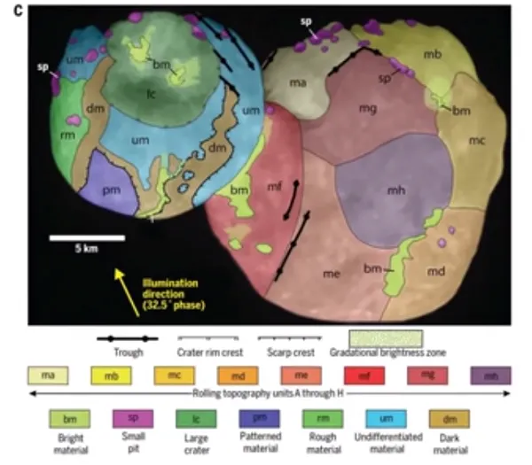 La ausencia de más cráteres grandes denota un déficit de objetos más pequeños que un kilómetro de diámetro, en el cinturón de Kuiper susceptibles de impactar, algo inesperado en una región donde abundan tanto los cuerpos medianos, su color es rojo uniforme y es debido al hielo de agua mezclado con moléculas orgánicas afectadas por los rayos cósmicos, siendo la más abundante, el metano, todo esto con sólo el 10 por ciento, veremos que nos depara el 90 por ciento restante.