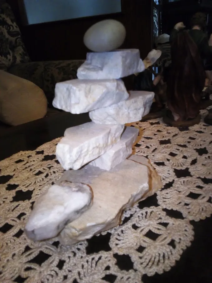 En la anterior fotografía, un grupo de piezas de mármol con una piedra redondeada, encontrada en la playa. Las heredé de mi padre. Las ordenamos y re-ordenamos. A mí me gusta la que les presento en la fotografía porque la encuentro muy dinámica, su equilibrio es delicado, frágil, el más pequeño deslizamiento hace caer todas, menos la base. Y... la última pieza que parece no afectar el equilibrio de las anteriores, también puede ocasionar su derrumbe. Sólo hay una que puede ser retirada sin afectar la estabilidad de la estructura, la colocada en la base, le da mayor dinamismo pero es de libre remoción.