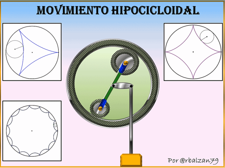Seguimos encontrando innumerables tipos de movimientos presentes en nuestro magnifico entorno en donde se desarrolla nuestra existencia, y el movimiento hipocicloidal representa uno de estos esenciales fenómenos de movilidad que nos ha permitido elevar nuestro nivel intelectual y en consecuencia social, pero si hablamos de la creación o generación de las distintas curvas hipocicloidales nos encontraremos que para tal propósito es necesario llevar a cabo un determinado movimiento, dicho movimiento es el que pudimos observar de forma práctica en cada uno de los anteriores gif animados en donde una circunferencia rueda o gira por el interior de otra de manera tangencial dando como resultado cada una de las curvas ya descritas y muchas otras más pertenecientes a la amplia familia de las hipocicloides.