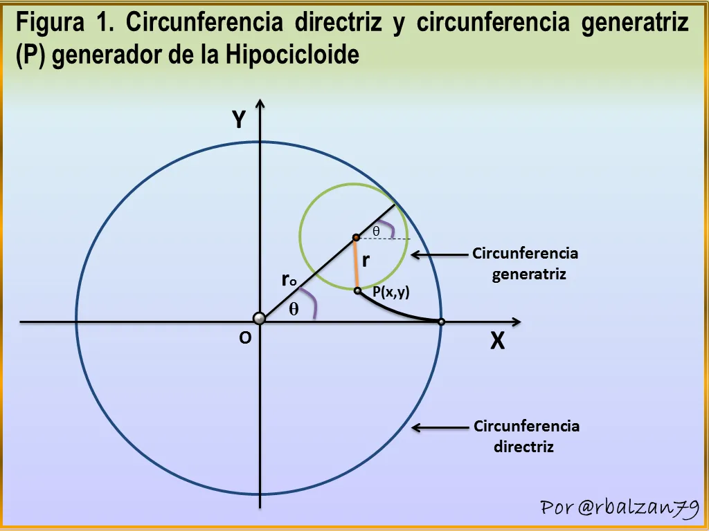 Ahora haremos rodar o girar esta circunferencia pero en esta ocasión por el interior de otra circunferencia (movimiento de forma interna), por lo tanto podemos decir que dichas curvas resultantes se diferencian de las epicicloides en relación al movimiento y lugar por donde gira la circunferencia que denominaremos generatriz ya que la misma lo hará por la  parte interior de la circunferencia directriz o fija de un determinado circulo generando de esta manera importantes curvas de la familia hipocicloidal.