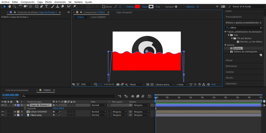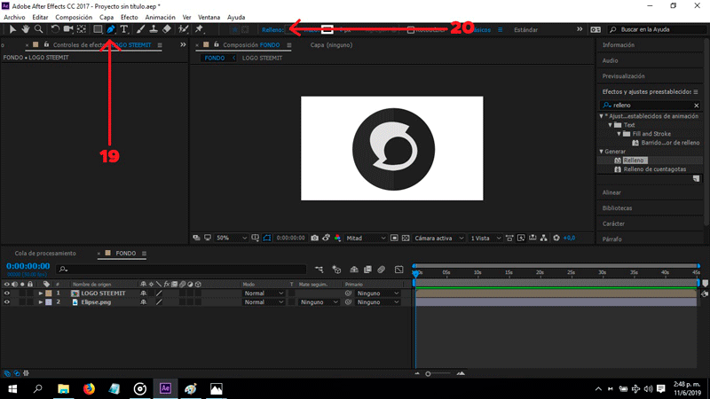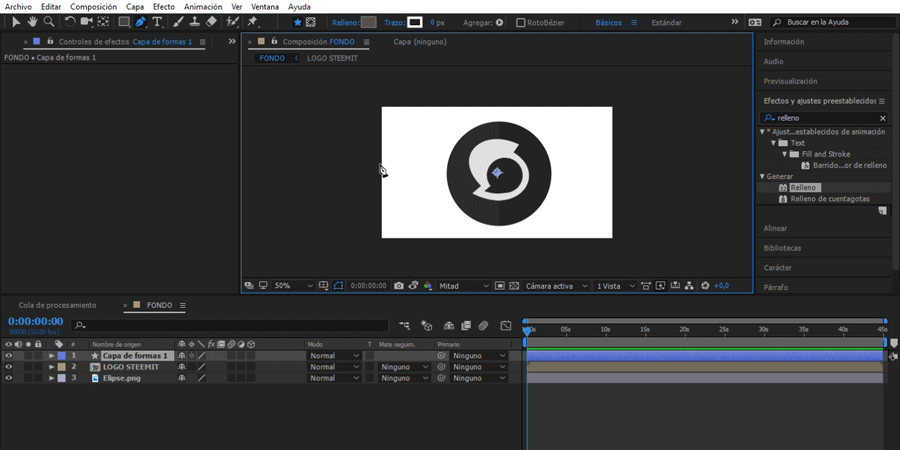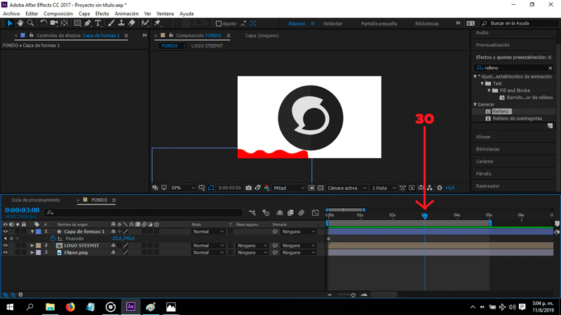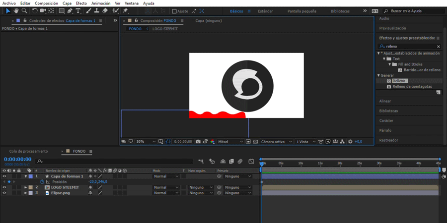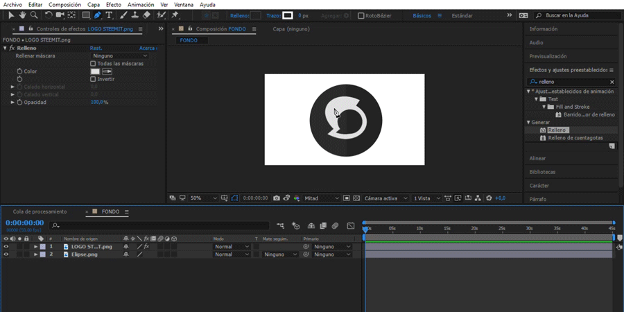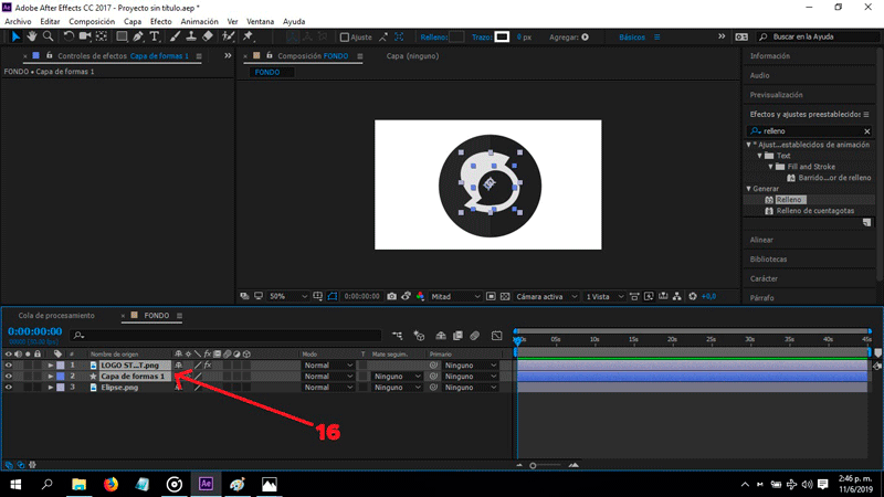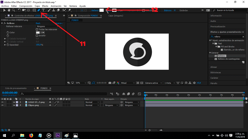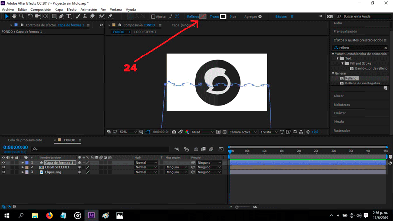 Vamos a efectos y ajustes preestablecidos , escribimos relleno y lo arrastramos hasta nuestro logotipo.