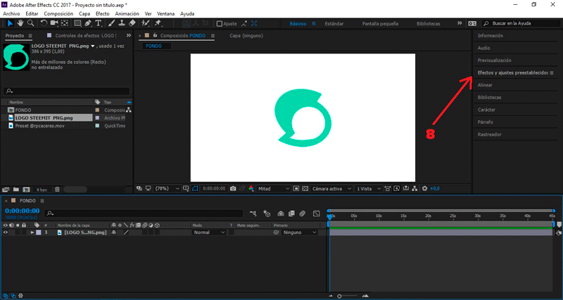 Nos posicionamos en la mitad de la transición de nuestro logo y movemos nuestro preset para que inicie en ese frame.