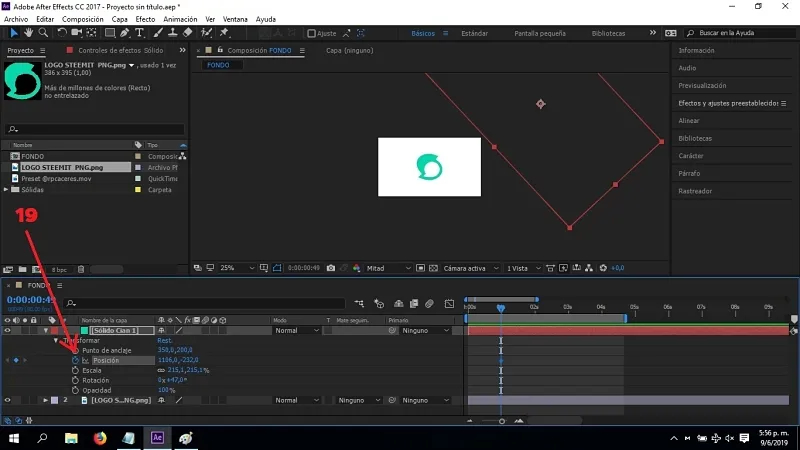 Quiero que dure aproximadamente 2 segundos en finalizar su entrada, para eso me posiciono en el segundo 3 y muevo manualmente el sólido hasta que cubra toda mi composición.