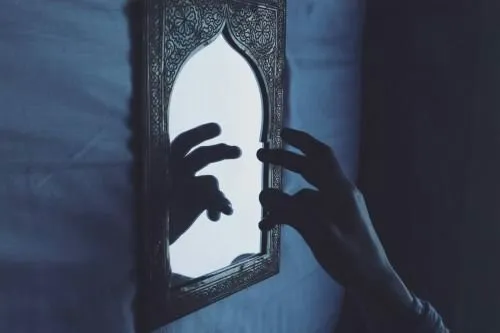 Tras varios siglos, finalmente encontró la descuidada alcoba. Tan pronto entró en ella, salió despavorido con temor en el alma, dirigiendo sus alas en dirección contraria. Ya que bajo la fría e inexorable superficie de aquél pulido espejo, bajo filamentos y ropajes de seda, aguardaba sonriente la imagen del diablo...