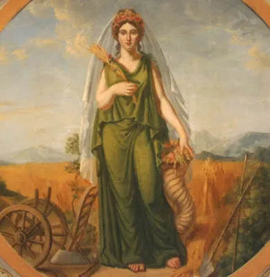 Ceres era hija de Saturno y Ops, madre de Proserpina, hermana de Juno, Vesta, Neptuno, Plutón y Júpiter. Enseñó a los humanos el arte de cultivar la tierra, de sembrar, recoger el trigo y elaborar pan, y gracias a esto fue considerada diosa de la agricultura. Su hermano Júpiter, cautivado por su belleza, engendró con ella a Proserpina (análoga de Perséfone en la mitología griega). También Neptuno se enamoró de ella, y para escapar de éste, Ceres se transformó en yegua, pero el dios se dio cuenta y se transformó a su vez en caballo, siendo así Ceres madre del caballo Arión.