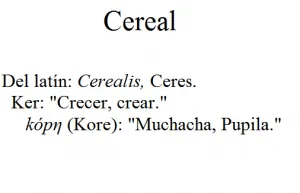 La palabra cereal proviene del latín “Cerealis” y está relacionada con Ceres¸ diosa romana de la agricultura, la fertilidad de la tierra y la abundancia de cosechas. Su equivalente en la mitología griega era Deméter. Su nombre de raíz protoindoeuropea: “Ker” significa “Crecer, crear”, que también está presente en el griego kópƞ (Kore=muchacha, pupila). Esta palabra también forma parte de la estructura de cerverza, cervecero o cervecear. Existe un planeta enano del cinturón de asteroides llamado Ceres, al igual que se usó como inspiración para el elemento químico Cerio (Ce), cuyo hallazgo tuvo lugar dos siglos después del descubrimiento del planeta.