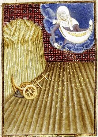 Tenía doce dioses menores que la ayudaban y estaban a cargo de los aspectos específicos de la agricultura: Vervactor, que transforma la tierra en barbecho. Reparator, que la prepara. Imporcitor (del latín imporcare, ‘hacer surcos’), que la ara en anchos surcos. Insitor, que siembra. Obarator, que ara la superficie. Occator, que la escarifica. Sarritor, que la escarda. Subruncinator, que la clarea. Messor, que cosecha. Conuector, que transporta lo cosechado. Conditor, que lo almacena, y Promitor, que lo distribuye.