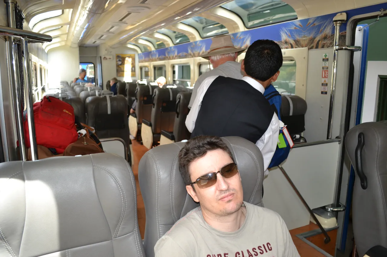 OR will you take the train? It follows the Urubamba River and ends at a small tourist town just below the Citadel of Machu Picchu. In this case (against my Doctor's wishes - I just started some fresh Chemotherapy treatment) I decided to go, but play it safe...I decided to take the train. In hindsight I wish I had done the full Inca trail, but that was then and this is now..anyways. Below is a photo of me on the train, feeling a bit rough :(