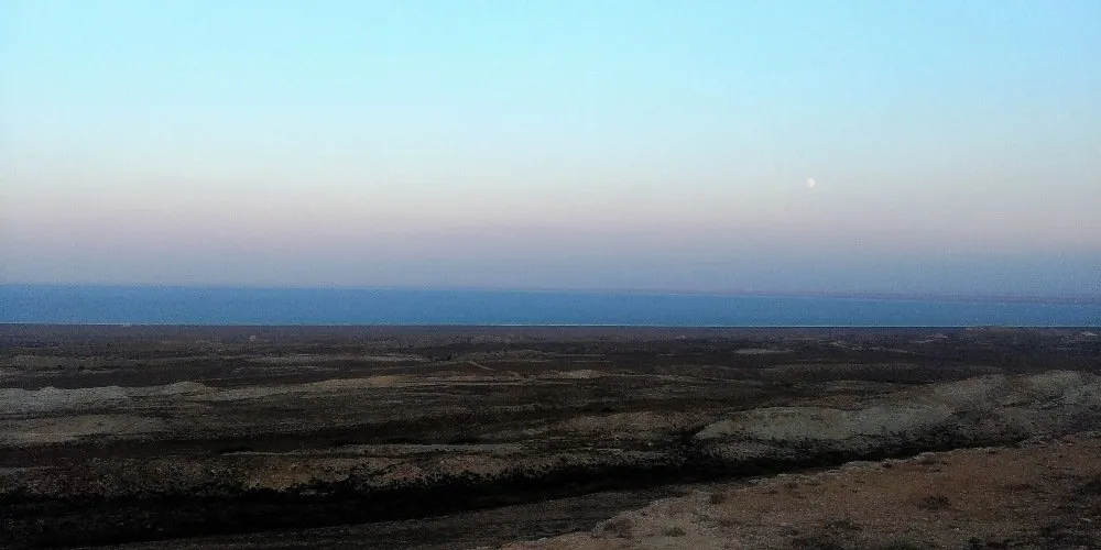 In total, we spent almost 10 or 11 hours on the road. When the sun was setting we saw a strip of water in the distance. Here it is, the Aral Sea ...
