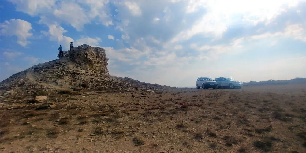 Having passed a little on the broken asphalt, we left on the grooved track in the sand. By the way, we drove quite comfortable. Firstly - the cars are good, and the secondly - the track is groomed and, the thirdly - the terrain is more or less flat without potholes. Our driver managed to accelerate up to 100 km / h.