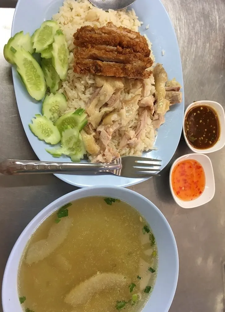 - 주문한 음식이 내어집니다. 사진이 자꾸 세워집니다. 이것 어찌 잡아야 하는지요? 튀긴 닭과 삶은 닭 두가지가 같이 얹혀지는 "카오 만 까이 쏭양ข่าว มัน ไก่ สอง ยัง"입니다. 튀긴닭은 기름기를 느끼지 못할 정도로 잘 튀겨서 겉은 바삭합니다. 삶은 닭은 입에서 녹습니다.