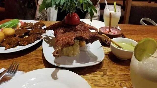 페루에서 먹어 본 가장 신기한 요리입니다!~ 기니피그 요리입니다. 기니피그는 설치류의 한 종류입니다. 이 음식점은 기니피그로 유명한데~ 만약에 구이 요리를 먹길 원하시면 미리 예약을 하는걸 추천합니다! 1시간 넘게 걸린다고 하네요~ 그래서 이 당시 튀김요리로.