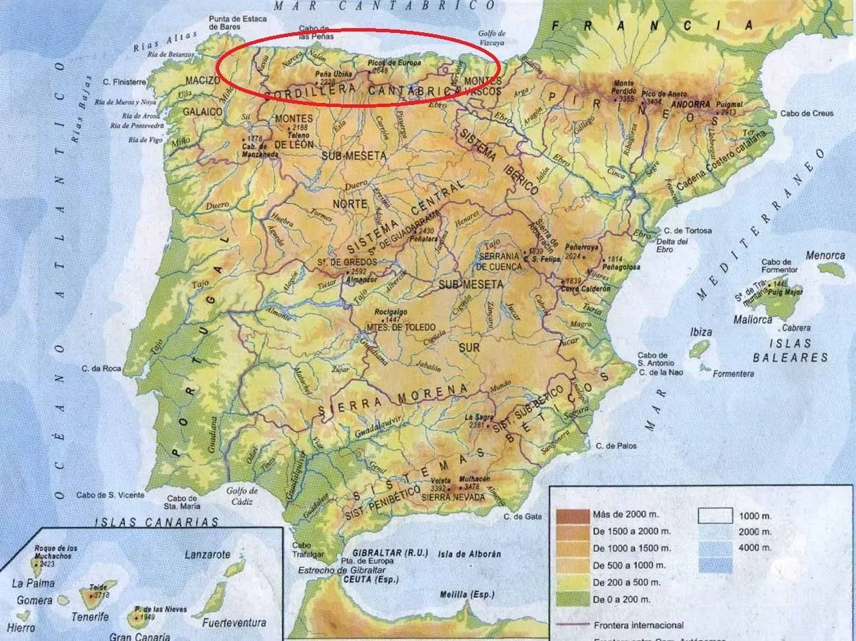 해안선은 단조롭고 평야는 좁으며, 남쪽은 메세타(Meseta)의 북쪽 한계인 칸타브리아(Cantcbrica) 산맥을 등지고, 서쪽은 산지를 사이에 두고 이베리아 반도의 북서쪽을 차지하는 갈리시아(Galicia) 지방과 접해 있다. 비스카야(Viscaya) 만에 면해 있기 때문에 기후는 편서풍의 영향을 받아 온난 다습한 해양성 기후를 나타내며, 연 강수량도 1,000mm 이상이다. 칸타브리아 산맥에서 흘러내리는 하천은 모두 짧고 깊은 협곡을 형성하고, 하류에 작은 선상지를 발달시킨 곳도 있다. 고산 지대에 있으며, 10월에서 5월까지 눈이 내린다. 겨울엔 주로 비와 화창한 날이 번갈아가며 있다.