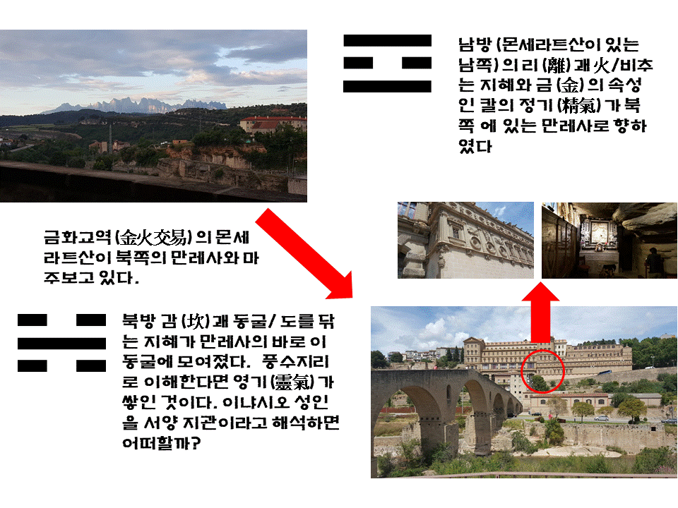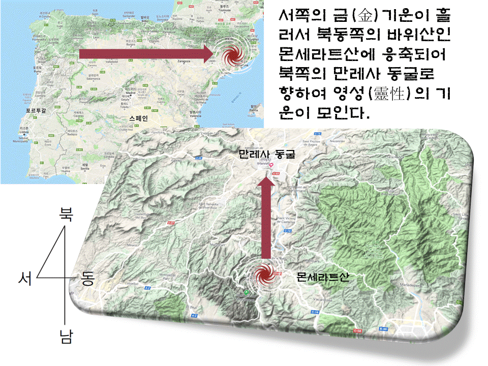 그런데 서방은 오행상 금(金)이라고 말했다. 스페인의 북쪽 산맥이 서쪽에서 동쪽으로 향하다가 북동쪽각주2에 위치한 몬세라트산 바위산에서 서쪽 끝의 기운이 응축된 것은 아닐까? 산맥의 형태가 재미있다. 북쪽에서 남쪽으로 향하면서 다시 북동쪽으로 고사리같이 말리는 형상이다. 기운의 작용에 의해서 돌돌 말리는 태극문양을 하는 것인가? 몬세라트산도 바위산이니 금(金)의 수렴 기운이 가득한 산이다. 아마도 바위로 이루어진 산이어서 금의 응축기운을 촉진시켜주는 것이 아닐까 생각해본다. 유유상종이라고 서쪽의 금기운이 동쪽의 돌산에서 응집된 것이다. 이것을 서방정토의 기운(영성의 기운)이 모인다고 해석한다면 어떨까? 그 기운이 지대가 낮은 북쪽의 만레사 동굴로 흘러서 모인다고 해석할 수 있지 않을까? 재미있는 것은 북방은 지혜를 상징하고 함몰의 의미를 가진 감(坎: 구덩이감)괘를 대표한다. 그러니까 이냐시오의 ‘영신수련’이 탄생할 수 있는 풍수지리적 개연성이 스페인 지형에 미리 내포하고 있었던 것은 아닐까? 적나라하게 표현하자면, 정신적 영성의 종자가 구멍(동굴)과 교접하여 사정할 것을 예정했다고 할까? 이냐시오는 영성의 씨앗으로 그 동굴에 들어가게 된 것인가?