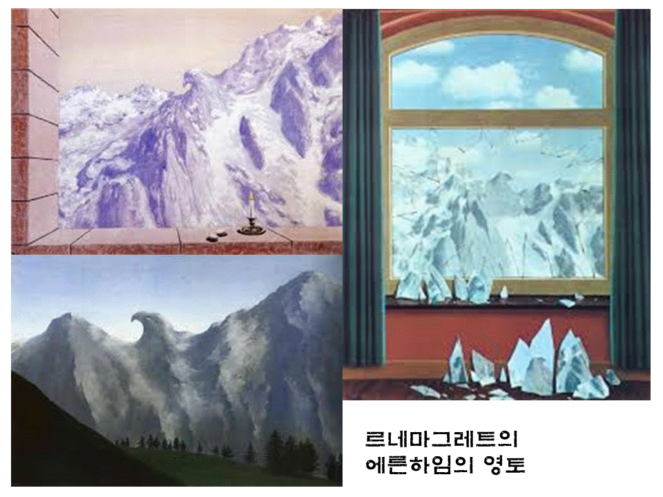 르네 마그레트의 에른하임의 영토: 나는 좌측 상단의 그림에서 흥미로웠던 것이 아래부분의 ‘달걀과 불빛을 발하는 초’이다. 이것을 역학적으로 해석하면 ‘북쪽’의 ‘자(子/씨앗/몸에서 성기는 북쪽, 머리는 남쪽으로 본다)’로 볼 수 있는데 초에 불이 붙어있는 것은 씨앗에서 ‘생명(정신)’이 움트는 것을 상징한다. 다시 말하면 ‘영성의 씨앗이 발하는 것’이다. 만레사 동굴이 몬세라트산에서 볼 때 북쪽에 있고 동굴이 ‘성기’와 관련이 있다는 사실이 재미있다. 그래서 이냐시오가 11개월간 동굴수행을 하면서 ‘영신수련’을 저술하였을까?