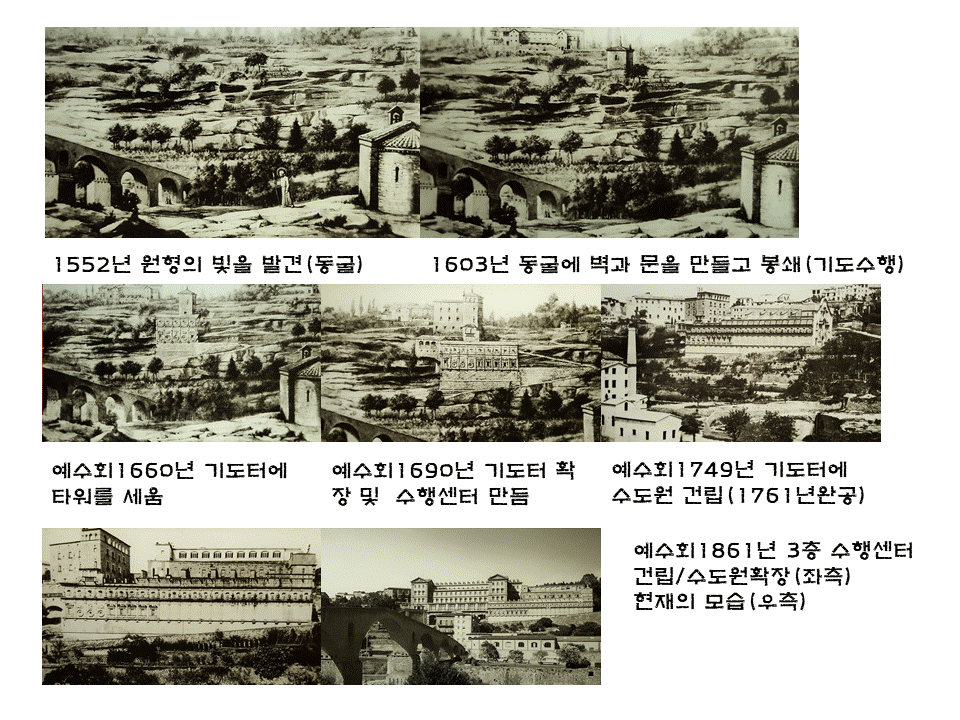 원형 빛의 환시로 찾아든 동굴 수행터위에 지금의 성당과 수행센터가 자리잡는 과정을 설명해주는 그림