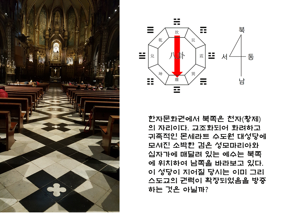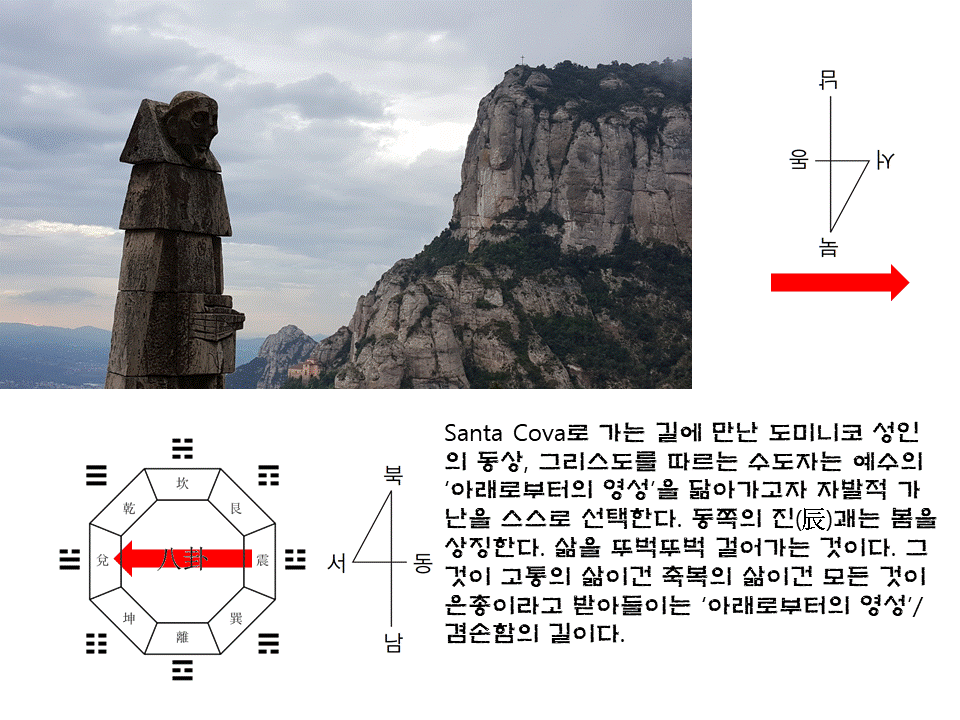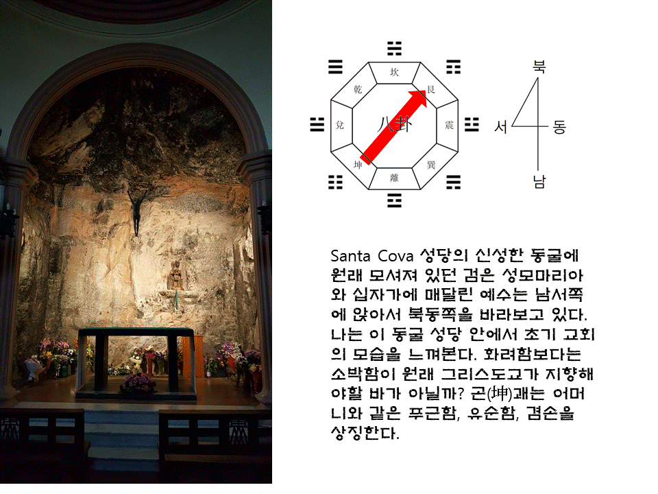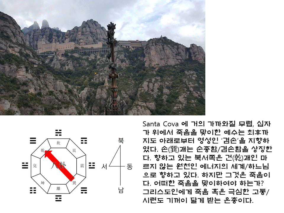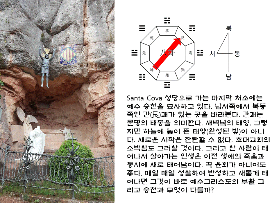 화려하고 웅장한 대성당에 어울리지 않게 소박한 검은 성모마리아와 그 앞에 멀리서 예수가 매달린 십자가는 북쪽에 앉아서 남쪽을 바라보고 있다(북좌남향). 그러나 900여년 전 동굴 속에서 발견된 검은 성모마리아는 남서쪽에 앉아 북동쪽을 바라보고 있다. 남서쪽을 주역에서는 곤방坤方이라고 하는데 포근하게 감싸주고 유순한 ‘대지, 어머니’를 상징한다. 그리고 탄생을 의미한다. 그런데 Santa Cova의 예수 승천 조각도 역시 남서쪽에 앉아서 북동쪽을 향하고 있다. 북동쪽 간방艮方이라고 하는데 문명이 끝나고 다시 발생하는 새벽녘을 상징한다. Santa Cova의 신성한 동굴의 검은 성모마리아는 어쩌면 부활하여 승천하는 그리스도교적 삶의 방향을 본받으라는 방향타로서 남서쪽에서 북동쪽을 바라보고 있는 것일까? 초기 교회의 신앙은 소박하여 온 세상을 환하게 비추는 정오(남쪽)보다는 새벽 여명에 가까울 것이다. 예수의 죽음과 부활을 북동쪽 간방艮方과 연관지어 본다.