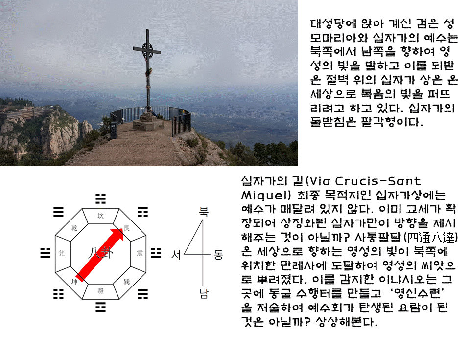 몬세라트 수도원은 1000년의 세월 동안 몇 번의 부침이 있었다. 전쟁으로 인하여 폐허가 되기도 했지만 곧 재건되었고 순례자(혹은 영성인), 일반인들에게 휴식과 영감을 선사해주는 편안한 안식처가 되어주고 있다. 나는 이곳에 배치된 십자가와 검은 성모마리아의 좌향풍수지리의 터를 결정할 때 좌향이란 터의 위치와 그것이 향하는 방향을 의미한다. 예를 들어 ‘서좌동향(西坐東向)’이란 자리 잡은 위치가 서쪽에 있고 동쪽을 바라본다는 의미이다. 이는 명당을 정하는 사람의 의도가 깔려있는 것이다.이 갖는 의미를 고찰하고자 한다. 물론, 정확한 설명이 아닐 수도 있다. 하지만 여행을 하면서 느꼈던 나만의 생각이기 때문에 학술적 엄밀성을 따라야 할 책임은 없다. 그리고 풍수지리가 학술적 인정을 받는 것도 아니고 역술가들이 “내 주장이 맞네”하며 서로 지지고 볶고 싸우는 형국이니 상관할 바도 아니다. 다만, 역학易學이란 변화를 다루는 학문인데 영학靈學이기도 하다. 변화라는 것이 고정되지 않고 바뀌는 것인데 그 변화라는 것이 영성이 아니고 무엇인가? 변화하기 때문에 우리는 인식할 수 있고 인식한다는 것이 곧 신령스러운 것이기 때문이다. 영성학이란 변화를 이해하는 자연철학이고 인연법을 이해하는 학문이기도 하다.
