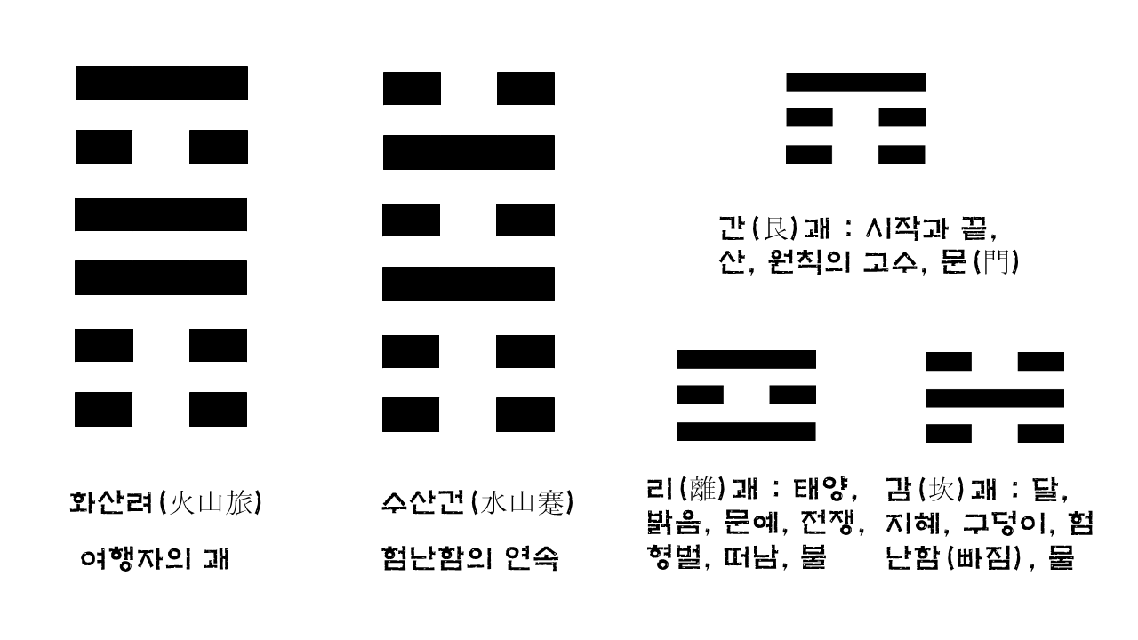 여행(화산려)은 머무름이 없는 것이다. 마치 산에 떠있는 태양과 같이 쉼 없이 움직이는 것이다. 태양을 머금은 우리 영혼(빛)의 존재는 정처없이 흘러간다. 그것이 리(離)괘가 가진 표상인데 여기에는 밝음(숨김없음)도 있고 화려함도 있고 강렬한 열정도 있고 전쟁과 같은 치열함도 안고 둥글게 뜨고 지고 반복한다. 감(坎)괘가 가진 표상은 물과 같고 달과 같다. 그리고 구덩이에 빠져들 듯이 험난하게 살아감을 암시한다(수산건). 험난하게 되는 것은 대개 미련 곰탱이처럼 심하게 머무르기 때문일 것이기도 하다. 집착, 강박이라는 그러한 정신놀음처럼, 산 위에 비바람이 몰아친다면 그 여행자는 위험하고 고될 것이다. 그러나 물의 메타포는 지혜다. 시련이 강할수록 그 영혼에 새겨지는 지혜의 문양은 더욱 깊어질 것이다. 물(감괘)과 불(리괘)은 상반되는 성질을 가졌지만 하나의 영혼이다. 태양의 빛에 반사되어 보이는 달은 바로 해를 품은 달이기 때문이다. 머무르지 않는 인생살이(여행/旅)가 험난함(산 위에서 질척거림/蹇)을 당연히 예정하지만 낭만도 함께 영혼의 마음속에 새겨놓는다.